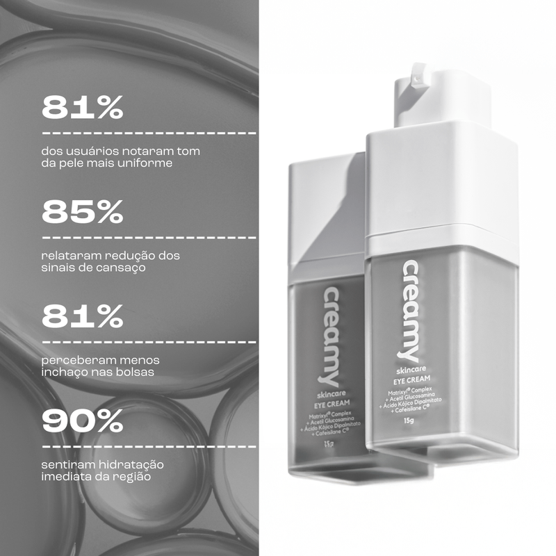 Creme para a região dos olhos desenvolvido para reduzir sinais de envelhecimento, como linhas finas, rugas e olheiras, deixando a área mais firme, hidratada e revitalizada. O Creamy Eye Cream Antissinais possui fórmula leve e de rápida absorção, indicada para a delicada pele ao redor dos olhos, ajudando a proteger, nutrir e suavizar o aspecto cansado.