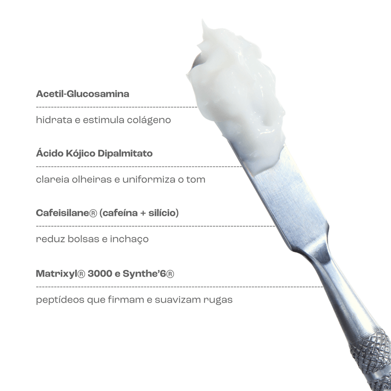 Enriquecido com ativos hidratantes e antioxidantes, contribui para melhorar a elasticidade, reduzir o inchaço e uniformizar o tom, promovendo um olhar mais descansado e rejuvenescido.