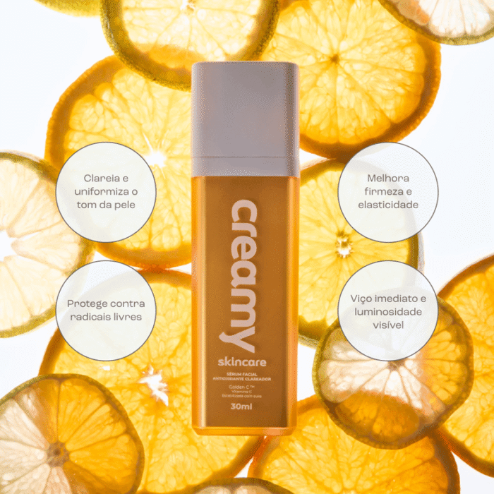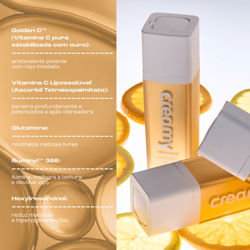 Sérum facial antioxidante desenvolvido para iluminar, uniformizar o tom da pele e combater os sinais do envelhecimento. O Creamy Vitamina C Gold possui fórmula avançada com vitamina C, que ajuda a reduzir manchas, melhorar a textura e devolver o viço natural da pele.